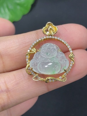 F37425540 Jadeite Inlaid Buddha Pendant with 18k Gold and Diamond Accents, Total Weight Approximately 3.5g