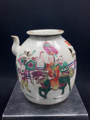 W38541217 Porcelain, 2 pieces, with chips and cracks, Late Qing Dynasty famille-rose "Kirin Bringing a Son" four-handled pot