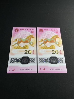 Q40729101 Two consecutive 2026 Year of the Horse zodiac commemorative banknotes with leopard serial number and gourd number