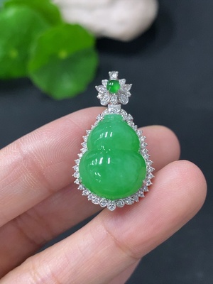 F33936143 Jadeite Gourd Pendant with 18K Gold and Diamond Accents, Total Weight Approx. 3g