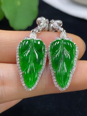 F35176034 Jadeite Leaf Inlaid Earrings No Mark 18K Gold Tested Non-Gold Ear Backs Diamond Accents Total Weight Approx. 6.43g (Excl. Ear Backs)