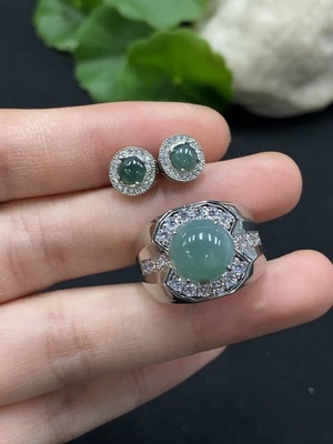 F36218357 Jadeite cabochon earrings / adjustable ring, non-gold setting