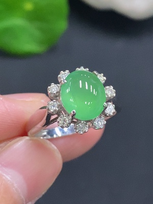 F35198099 Jadeite Cabochon Solitaire Ring 18K Gold Size 14 Total Weight Approx. 4.9g (With Diamond Accents)