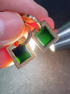 F37382747 Jadeite inlaid earrings with 74% gold content, total weight approximately 4g, set with diamonds