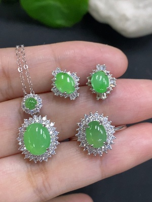F36216526 Jadeite Cabochon Pendant with Ring and Earrings Set Sell as a Lot Adjustable Size Non-Gold Setting