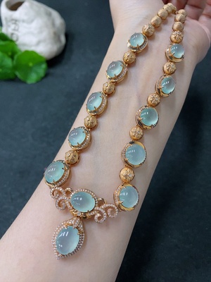 F34042838 Jadeite Cabochon Set Necklace with 18K Gold and Diamond Accents, Total Weight Approximately 44.1g