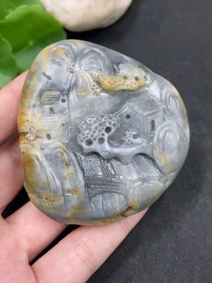 H35168579 Hetian Jade Handheld Carving - Landscape, Undetermined Skin Color Origin, Contains Other Mineral Components, Total Weight Approximately 131.3g