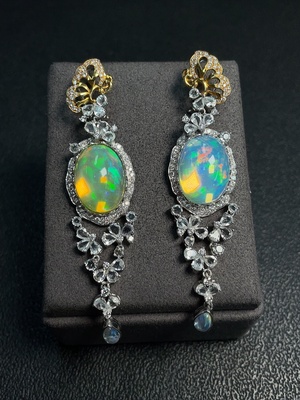 C38527812 18K Opal Earrings, Color Origin Undetermined, Accent Stones Possibly Non-Natural, Diamond Accents Only Minimal Side Stones, Total Weight Approx. 27.88g