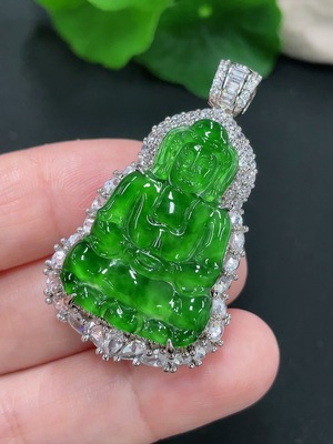 F33906471 Jadeite Guanyin Pendant with 18K Gold Clasp, Total Weight Approximately 14g, Set with Diamonds