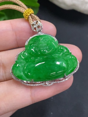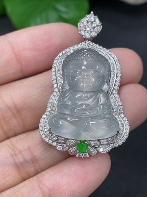 F38510781 Jadeite Baby Buddha Pendant with 18K Gold and Diamond Inlay, Total Weight Approximately 9.2g