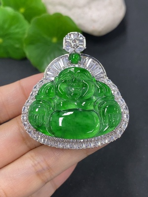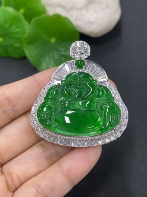 F39663789 Jadeite Buddha Pendant with 18K Gold Clasp, Total Weight Approximately 6g, Set with Diamonds