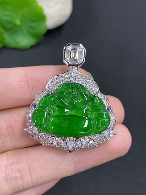 F39612547 Jadeite Buddha Pendant with 18K Gold Clasp, Total Weight Approximately 6.2g, Diamond Accented