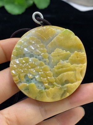 F34966145 Jadeite landscape pendant, total weight about 26.4g (including rope weight) (yellow part color origin undetermined) (beads non-A)