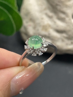 F35198099 Jadeite Cabochon Solitaire Ring 18K Gold Size 14 Total Weight Approx. 4.9g (With Diamond Accents)