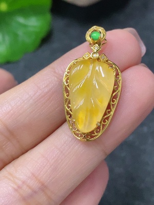 F34030925 Jadeite inlaid leaf pendant with 18k gold and diamond accents, total product weight approximately 1.91g, color origin of yellow parts undetermined