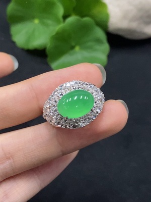 F29409724 Jadeite Cabochon Ring with 18K Gold, Size 15, Accented with Diamonds, Total Weight Approx. 7.7g
