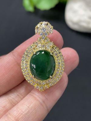 F36334268 Jadeite Cabochon Pendant with 18K Gold and Diamond Accents, Total Weight Approx. 12.44g