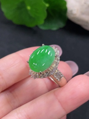 F37354311 Jadeite Cabochon Ring with 18K Gold, Size 19, Total Weight Approx. 4.6g (Colorless Accent Stones are Diamonds)