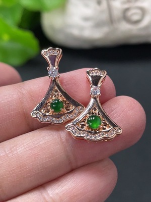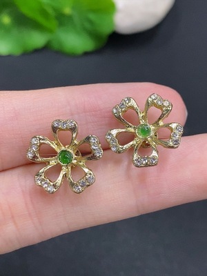 F30529930 A pair of Jadeite cabochon earrings set in 18k gold with diamond accents, total weight approximately 6.63g