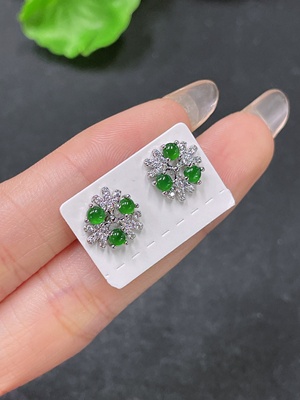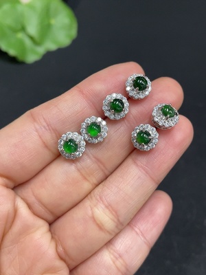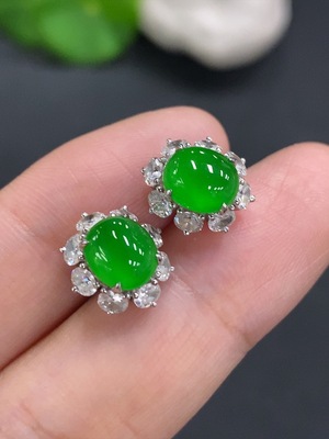 F30529930 A pair of Jadeite cabochon earrings set in 18k gold with diamond accents, total weight approximately 6.63g