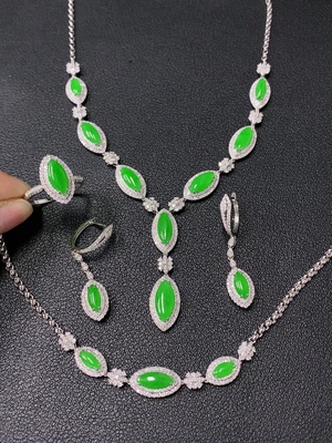 F33912511 Jadeite Inlaid Jewelry Set (including necklace, bracelet, earrings, ring) 18k with diamond accents, total weight approx. 23.5g (full set)