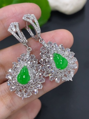 F37454713 Jadeite Gourd Inlaid Earrings 18k with Diamond, Total Weight Approx. 6.89g