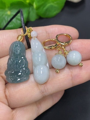 F19077413 Jadeite Guanyin Pendant + Inlaid Earrings (Non-Gold Inlaid)