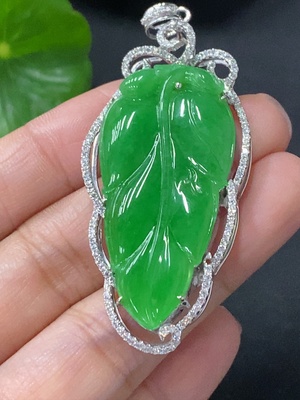F35088909 Jadeite inlaid leaf pendant with 18k gold and diamonds, total weight approximately 16.92g