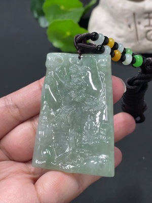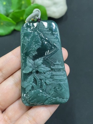 F35196693 Jadeite landscape plaque pendant with a total weight of approximately 82.8 grams (including rope weight) and some damage