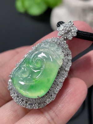 F36291777 Jadeite Ruyi Inlaid Pendant with 18K Gold and Diamond Accents, Total Weight Including Rope Approximately 10.76g