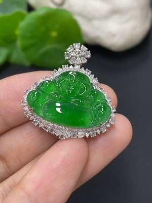 F38517048 Jadeite Buddha Pendant with 18K Gold Clasp, Total Weight Approx. 7.9g, Diamond Accented