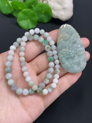 F32742381 Jadeite Landscape Pendant with Beaded Necklace Sell as a Lot