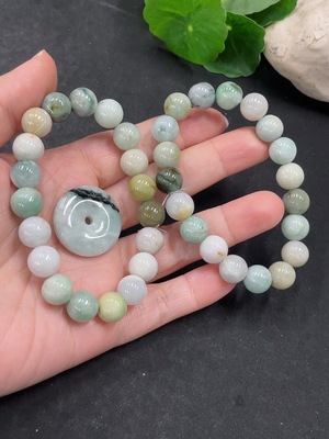 F36281771 Jadeite Bracelet/Ping An Kou Pendant with Other Mineral Components, Total Weight Approximately 68.03g