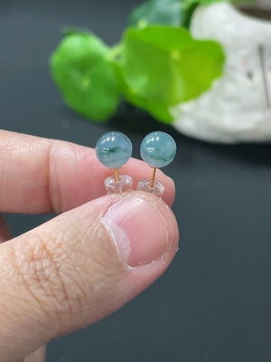 F34058448 Jadeite bead stud earrings, pair, approx. 6.4mm, total weight with ear backs approx. 1.16g, set in 18k gold