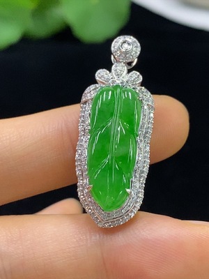 F36210370 Jadeite Leaf Inlaid Pendant with 18k Gold and Diamond Accents, Total Weight Approximately 2.1g