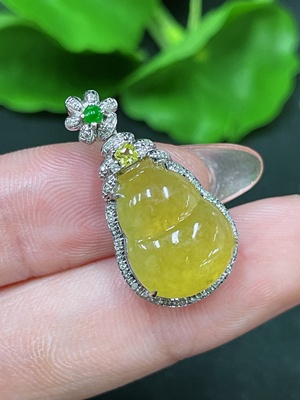F34983584 Jadeite gourd inlay piece set in 18k gold with diamond accents, colorless, total product weight approximately 3.03g, color origin undetermined