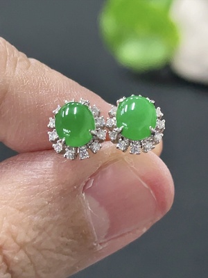 F35108964 Jadeite cabochon stud earrings pair, 18k gold setting, non-gold ear backs, diamond accents, approximate weight 1.5g (excluding ear backs)