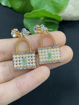 F37405158 Jadeite Earrings 18k Gold Set with Diamonds Total Weight Approx. 2.47g