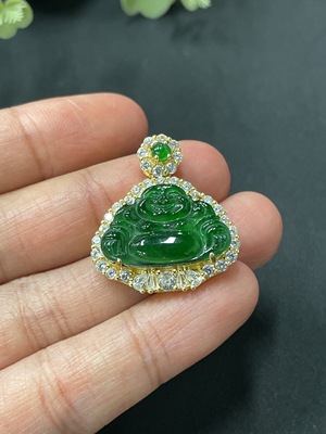 F34076106 Jadeite Pendant Buddha with 18k Gold and Diamond Accents, Total Weight Approximately 5.6g