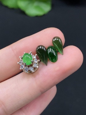 F35079965 Jadeite cabochon earrings + ring, non-gold setting, adjustable size