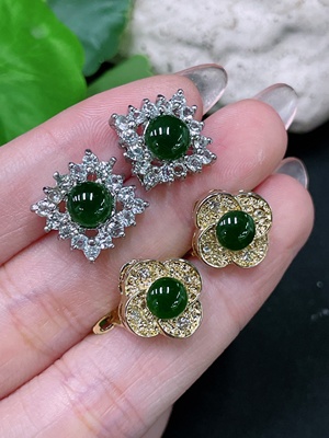 F34958349 Jadeite Cabochon Inlaid Earrings Sell as a Lot Non-gold Inlaid