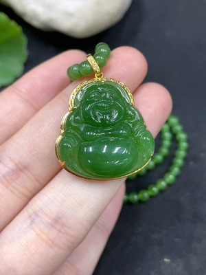 H0245851 Hetian Jade Maitreya Buddha Inlaid Pendant with Cracks, Approximately 27.93g, Non-Gold Inlaid