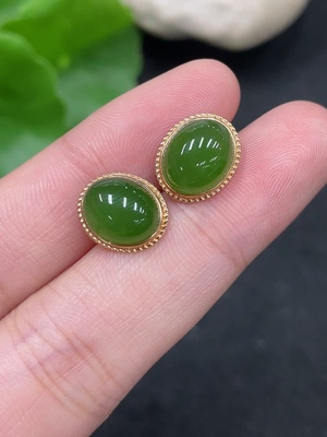 H36280165 Hetian Jade Cabochon Earrings with 18k Gold Setting, Total Weight Approx. 2g