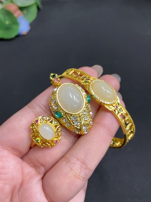 H36311685 Hetian Jade Inlaid Pendant + Adjustable Ring + Bracelet Total Weight Approx. 27.1g Non-Gold
