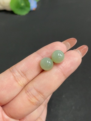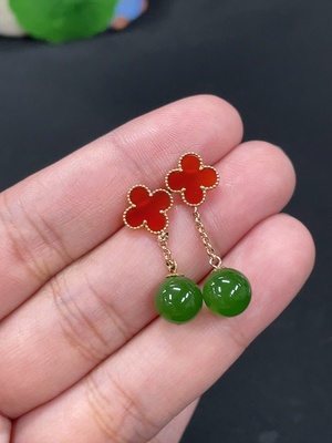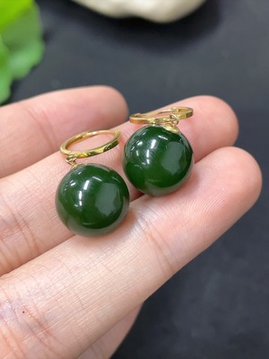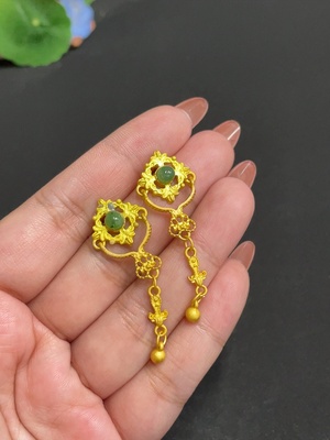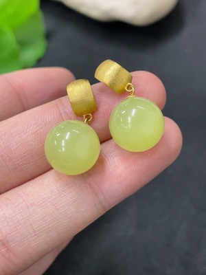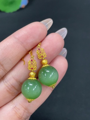 H38472116 Hetian Jade Jasper Inlaid Earrings, approx. 8mm, total weight about 2.8g, beads not Hetian Jade, needle suspected gold-plated, rest 18k