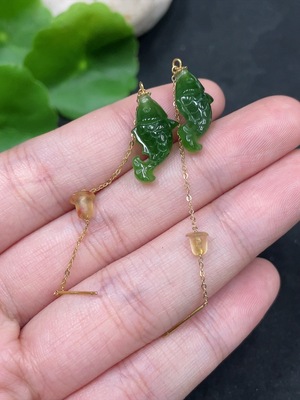H36297457 Hetian Jade Jasper Fish Inlaid Earrings 18k Gold Total Weight Approx. 2g (Including Ear Studs)