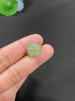 H38471773 Hetian Jade Inlaid Ring "Flower Blooms and Wealth Flourishes" Size 15.5 Total Weight Approx. 2.9g 18K Band Gold Content 72%