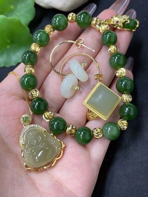 H39653582 Hetian Jade Bracelet + Adjustable Inlaid Ring + Pendant + Earrings Non-Gold Total Weight Approx. (Including Chain) 40.8g