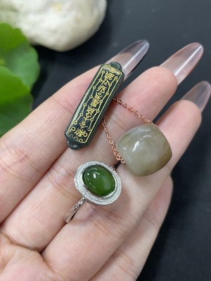 H1021511 Hetian Jade Inlaid Pendant + Ring Set (Sold as a Lot, Some with Veins/Cracks, Total Weight 5.9g)