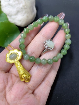 H39634698 Hetian Jade Inlaid Pendant Adjustable Ring Non-Gold Inlay Hand String Beads Approx. 5.6mm Total Weight Approx. 14.6g